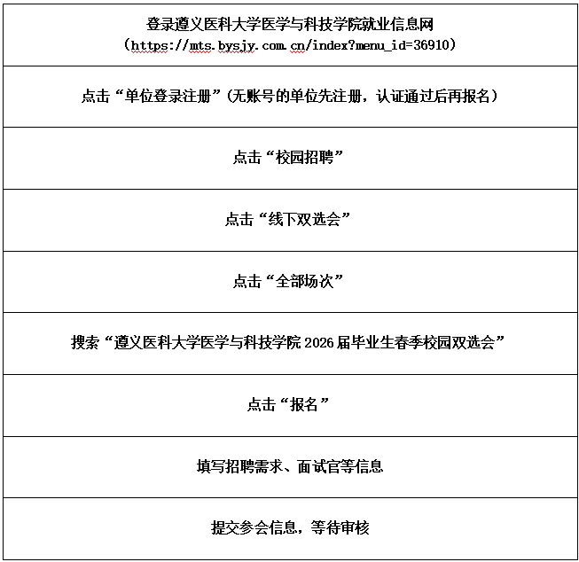 1、報名成功后,貴單位招聘信息將掛遵義醫(yī)科大學(xué)醫(yī)學(xué)與科技學(xué)院就業(yè)信息網(wǎng)進(jìn)行精準(zhǔn)宣傳;